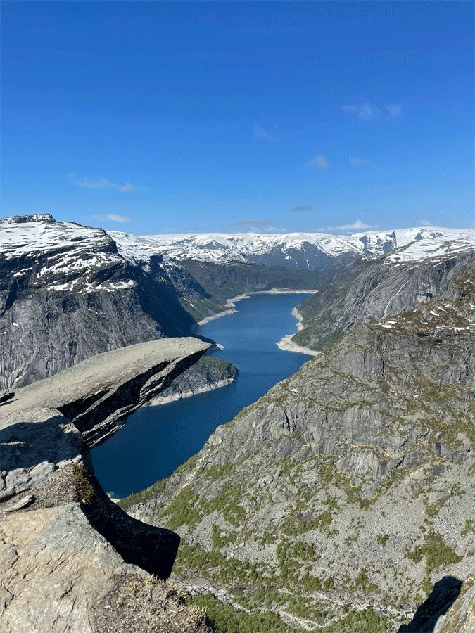 De spectaculaire rotstong die 700 meter boven het Ringedalsvatnet uitsteekt. Een uitdagende 28 km hike voor de avontuurlijke wandelaar.